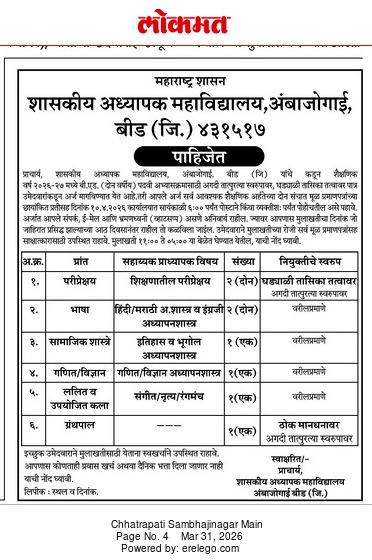 शासकीय अध्यापक महाविद्यालय, अंबाजोगाई, जि. बीड येथे शैक्षणिक वर्ष 2026–27 साठी सहाय्यक प्राध्यापक व ग्रंथपाल पदांसाठी भरती जाहीर करण्यात आली आहे. ही भरती तात्पुरत्या व तासिका तत्वावर (CHB) केली जाणार आहे.